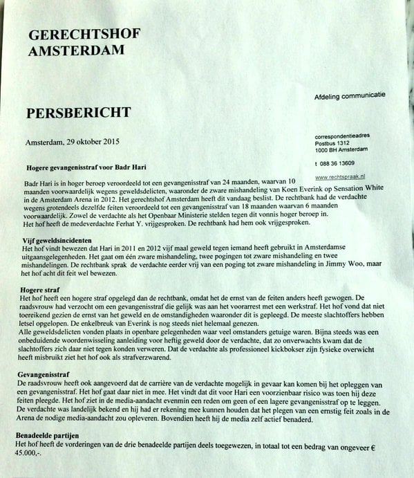 و كان المدعي العام الهولندي بمحكمة أمستردام، قد طالب بسجن بدر هاري لثلاث سنوات نافذة، لكن و بعد الاستئناف استفاد  هاري من حكم مخفف بحيث سيقضي في السجن سنة وشهرين، فضلا عن أداء غرامة مالية قدرها  45 ألف أورو.