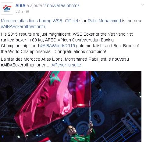 أعلنت الجامعة الدولية للملاكمة هواة (AIBA) عن فوز البطل العالمي محمد ربيعي بلقب ملاكم شهر أكتوبر (BOXER OF THE MONTH) بعد فوزه في الاستفتاء الذي نظمته على صفحتها الرسمية أمام كل من الفرنسي طوني يوكا و الكوبي خوليو سيزار ديلا كروز و الارلندي مايكل كونلان .