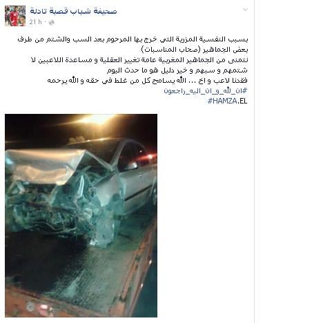 كشفت صفحة فريق شباب قصبة تادلة لكرة القدم بموقع التواصل الاجتماعي فايسبوك، أن اللاعب يونس فتحي، الذي توفي يوم أمس الأحد إثر حادثة سير ، تعرض للسب والشتم من قبل بعض جماهير فريقه .