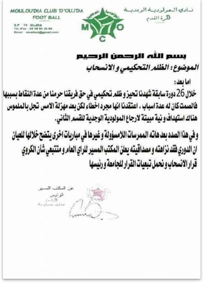 قرر فريق مولودية وجدة الانسحاب من البطولة الاحترافية لكرة القدم ، احتجاجا على الظلم التحكيمي الذي تعرض له هذا الموسم، وفق ما ورد في بلاغ أصدره اليوم الاثنين.