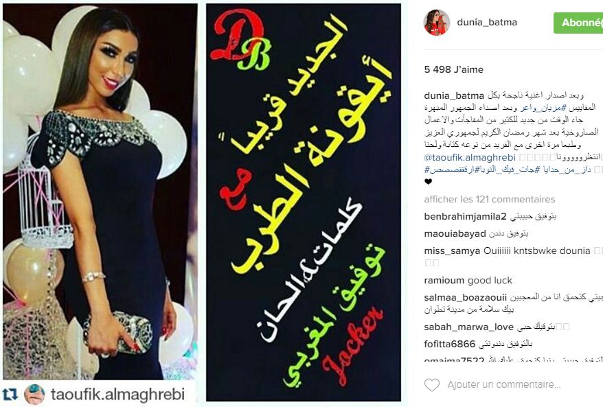 وعدت الفنانة المغربية، دنيا بطمة، جمهورها بالكثير من المفاجآت بعد شهر رمضان ، حيث نشرت صورة عبر موقع التواصل الاجتماعي "انستغرام "، كتبت فيها : "الجديد مع مع أيقونة الطرب كلمات وألحان، توفيق المغربي".