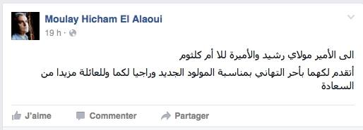 عقب اعلان خبر ازديان فراش الأمير مولاي رشيد بمولود بكر ذكر ، توجه ابن عمه الأمير مولاي هشام برسالة تهنئة خاصة ، نشرها على حسابه الخاص بالفيسبوك ، بارك من خلالها لكل من الأمير مولاي رشيد و الأمير أم كلثوم أن رزقهما الله هذا المولود ، راجيا لهما و للعائلة مزيدا من السعادة .