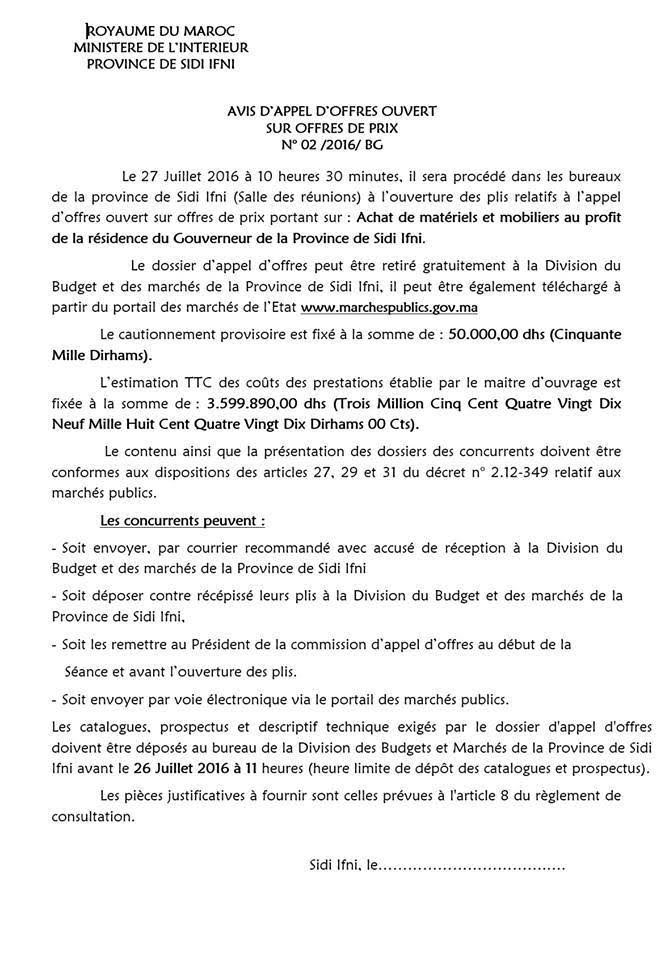 هذا و سيتم فتح الأظرفة يوم 27 يوليوز 2016 على الساعة العاشرة والنصف صباحا بمكاتب عمالة سيدي إفني، و قد حددت قيمة مبلغ الضمانة المالية بالنسبة للمتنافسين على طلب هذا العرض في مبلغ 50 ألف درهم.