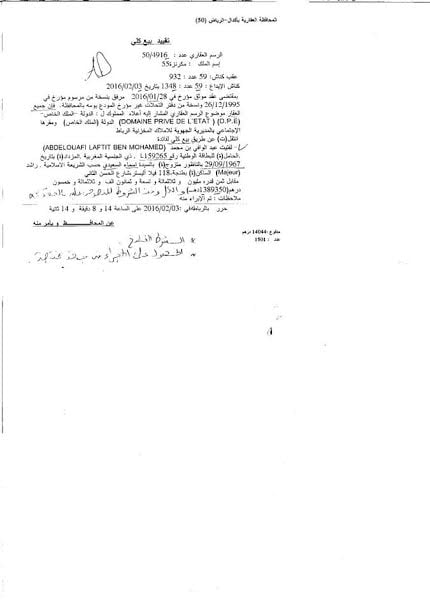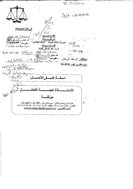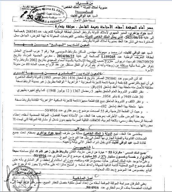 هذا وحملت وثيقة الرسم العقاري التي تؤكد الواقعة ، توقيع كل من المدير الجهوي لأملاك الدولة بالرباط، من جهة، ووالي الرباط عبد الوافي لفتيت، من جهة ثانية.
