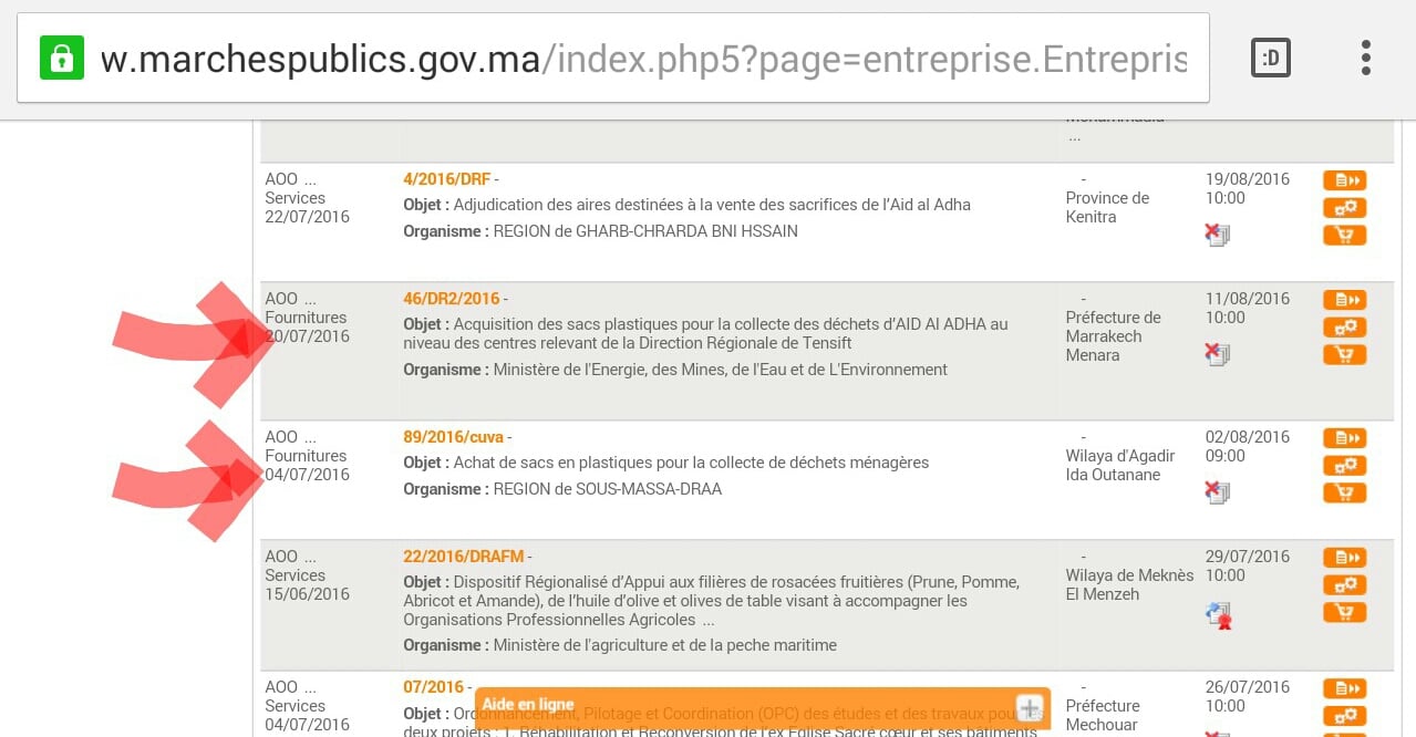 ففي الموقع الرسمي الخاص بالصفقات العمومية، تم  نشر طلبات عروض خاصة باقتناء بلاستيك -sac- ، سيستعمل في جمع فضلات عيد الأضحى، و الغريب أن الجهة المنظمة لهذه الصفقات هي وزارة الطاقة والمعادن والماء والبيئة وستفتح العروض بمقر عمالة مراكش واخر اجال 11/08/2016، فيما و في نفس الموقع نشر اعلان عن طلب عروض للبلاستيك الخاص بالفضلات المنزلية، أعلن عنه مجلس جهة سوس ماسة درعة، وسيتم فتح العروض بمقر ولاية اكادير اليوم 02/08/2016 ، كما توضح الوثيقة ورابط الموقع.