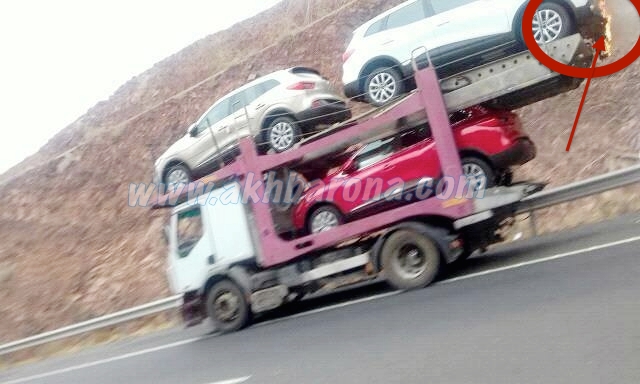 حصريا و بالصور : النيران تلتهم 5 سيارات جديدة كانت محملة على متن شاحنة و هذا ما خلفته‏