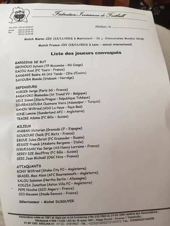 وكان مدرب المنتخب الإيفواري أعلن عن قائمة ال24 لاعبا الذين تم استدعاؤهم للمباراة الودية المقررة ضد منتخب فرنسا يوم 15 نونبر الجاري في فرنسا.