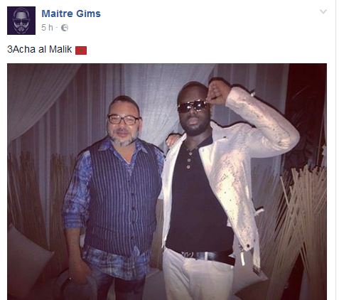 maitre gims رفع صورة على حسابه الفايسبوكي وهو واقف أمام الملك محمد السادس الذي كان يبدو سعيدا بدوره، وأرفقها بالتعليق التالي : عاش الملك وبجانبه علم المملكة المغربية.