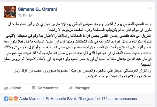 خلقت تدوينة لنائب الأمين العام لحزب العدالة والتنمية ، والمسؤول الإعلامي للحزب ، سليمان العمراني ، على حسابه الخاص بالفيسبوك ، جدلا واسعا ، حينما تحدث عن المشاورات الحكومية الحالية التي يقودها رئيس الحكومة المعين ،سعد الدين العثماني ، حيث دعا إلى " إعمال القواعد الشرعية في بناء التحالفات" ، وأخذ الدروس من " صلح الحديبية ".