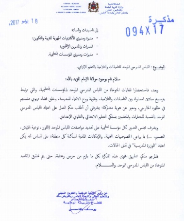 أصدر وزير التربية الوطنية والتكوين المهني والتعليم العالي والبحث العلمي مذكرة جديدة يفرض موجهة إلى مدراء ومديري الأكاديميات الجهوية للتربية ومدراء المؤسسات التعليمية يفرض فيها على تلاميذ التعليم العمومي ارتداء لباس مدرسي موحد بدءا من الموسم المقبل.