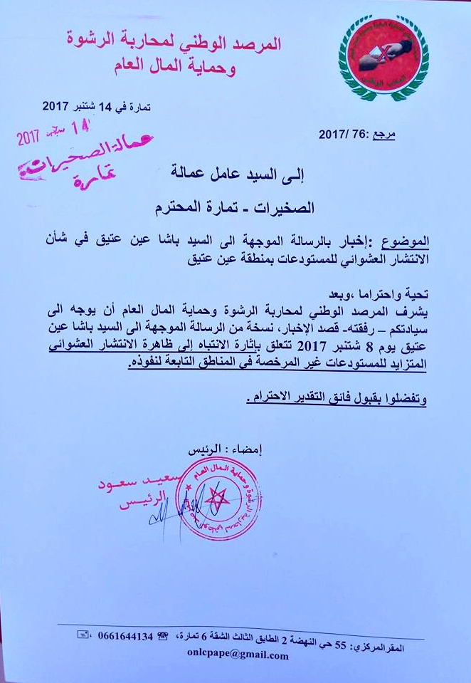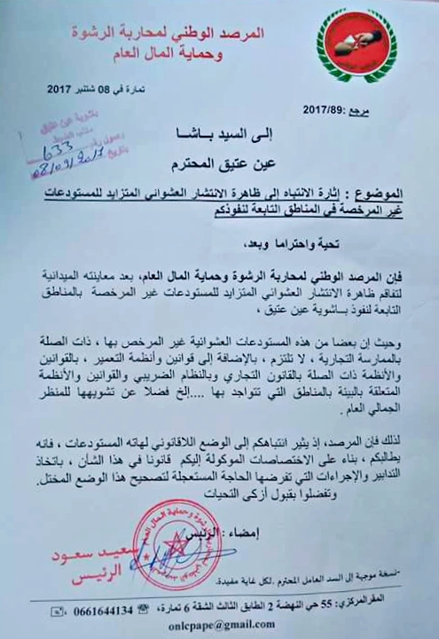 خروقات فاضحة جدا تلك التي كشف عن المرصد الوطني لمحاربة الرشوة وحماية المال العام، في رسالة له إلى كل من عامل إقليم الصخيرات - تمارة و كذا باشا جماعة عين عتيق المحاذية لمدينة تمارة ، حيث أكد المرصد في مراسلاته، أنه بعد زيارات ميدانية للجماعة المذكورة، اتضح بشكل فاضح انتشار مستودعات عشوائية غير مرخصة لها من قبل السلطات، أغلبها ذات طابع تجاري ، لا تلتزم علاوة على عدم احترامهما لقانون التعمير- لا تحترم - القانون التجاري و لا تلتزم بالنظام الضريبي و لا حتى الأنظمة المتعلقة بالبيئة حسب ما جاء في المراسلة.
