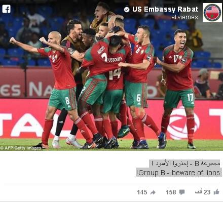 و بعد قرعة المونديال، نشرت الصفحة الفايسبوكية الرسمية للسفارة ، صورة لأسود الأطلس، مرفقة بتدوينة بالعربية والإنجليزية جاء فيها "مجموعة B - إحذروا الأسود ! Group B - beware of lions!".