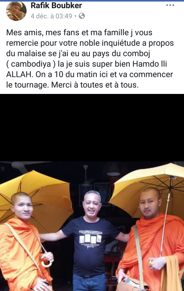 تعرض الممثل المغربي "رفيق بوبكر" لوعكة صحية ألمت به أثناء تواجده "بكامبوديا" من أجل تصوير عمل فني ،ونقل على إثرها للمستشفى لتلقي العلاجات الضرورية.