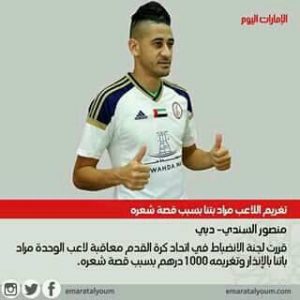 غرمت لجنة الانضباط ، لاعب الوحدة المغربي مراد باتنا بتغريمه ألف درهم بسبب «قصة شعره» ، التي ظهر بها خلال مباراة فريقه أمام الوصل، في دوري الخليج العربي الإماراتي.