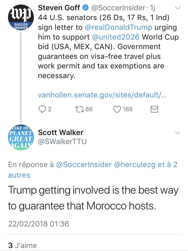 حظوظ المغرب في تنظيم مونديال 2026، تعززت بشكل قوي جدا، بعد امتناع و مقاطعة 58 سيناتورا عن التوقيع على الرسالة الموجهة لترامب، ما يعني أن الملف الثلاثي ( امريكا و كندا و المكسيك )، بات مهددا بالالغاء بشكل كبير، خاصة وأن رؤساء الدول الثلاث لم يتفقوا بعد على أهم مرتكزات التنظيم المشترك المتعلقة أساسا بحرية تنقل جماهير البلدان الثلاثة وفتح الحدود البرية والجوية في وجه جماهير بقية المنتخبات المشاركة من القارات الخمس.