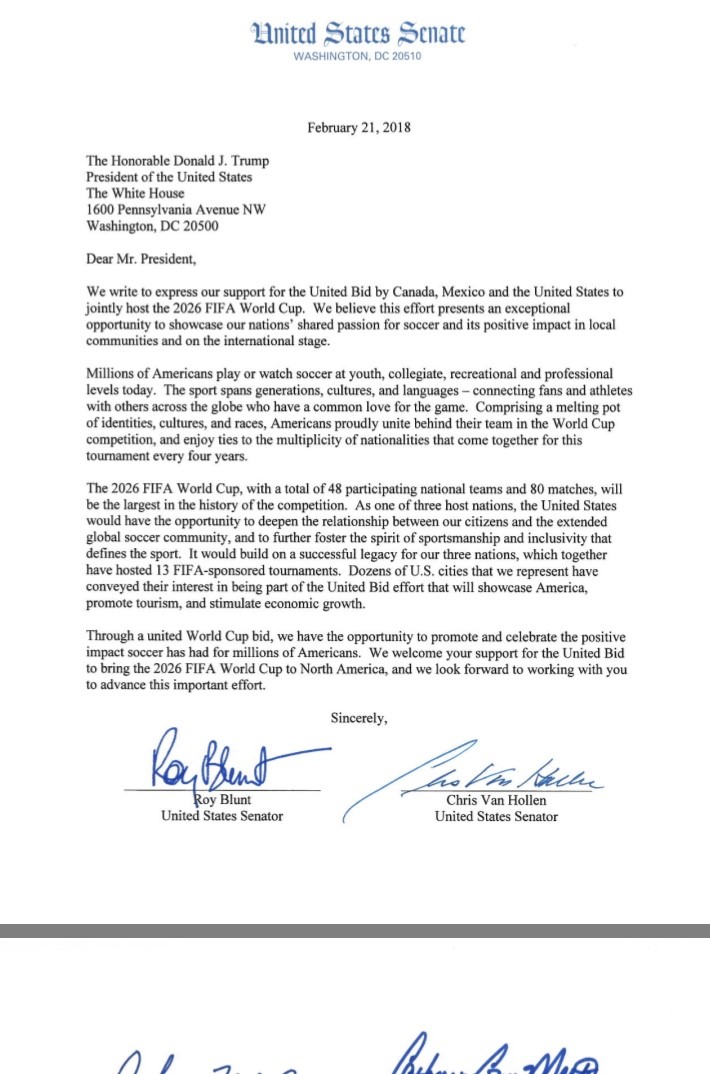 وجه 44 سيناتورا أمريكيا من الجمهوريين من أصل 100 بالكونغرس، أول أمس الأربعاء، رسالة إلى الرئيس الأمريكي دونالد ترامب التمسوا عبرها تزكية ودعم الملف الأمريكي المشترك مع كندا و المكسيك لتنظيم مونديال 2026، في الوقت الذي لازال فيه ترامب مترددا بشأن توقيع دعمه للملف المشترك، بسبب معارضته القاطعة لدخول المكسيكيين إلى الأراضي الأمريكية بدون تأشيرة، بعد أن دعا سابقا إلى طرد ألاف الأجانب الحاصلين على تأشيرة العيش بالولايات المتحدة ومنع آخرين من القدوم الى أمريكا.