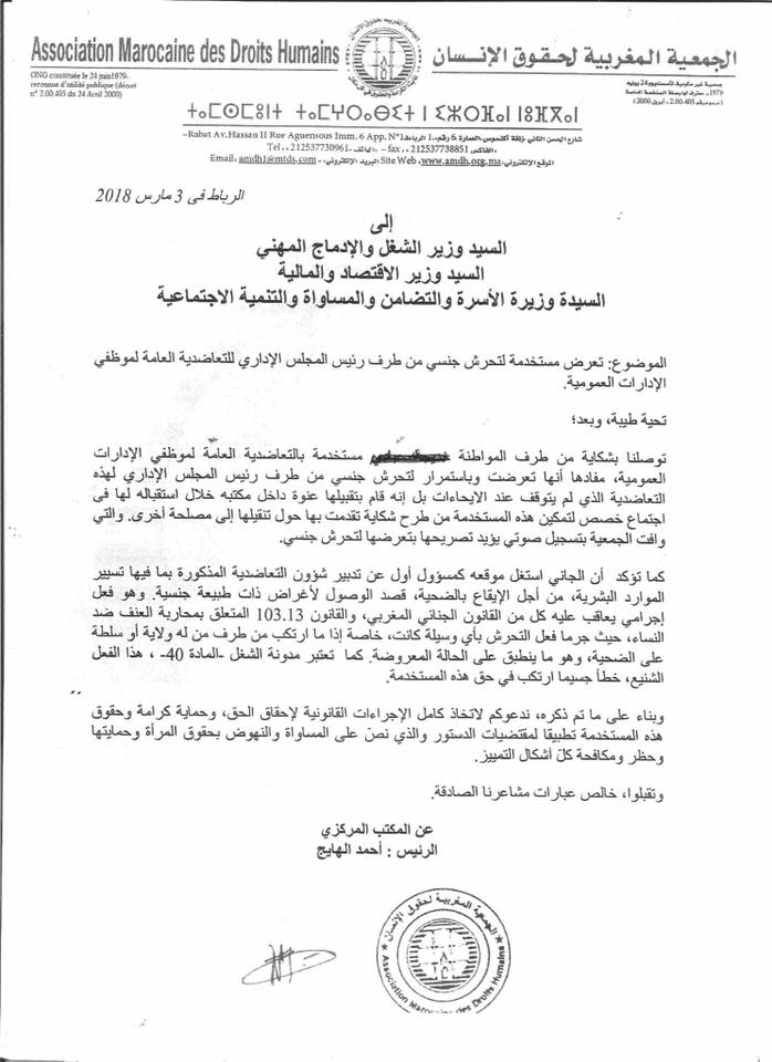 تفاصيل مثيرة جدا، تلك التي تضمنتها رسالة رفعتها الجمعية المغربية لحقوق الإنسان، إلى السادة وزير التشغيل و الإدماج المهني، وزير الإقتصاد و المالية و السيدة وزير الأسرة و التضامن، حيث كشفت النقاب عن تعرض مستخدمة بالتعاضدية العامة لموظفي الإدارات العمومية، لتحرش جنسي من قبل رئيس المجلس الإداري للمؤسسة المذكورة، حيث أكدت الهيئة الحقوقية ان الرئيس المذكور استغل منصبه من أجل الإيقاع بالضحية، بهدف بلوغ أغراض ذات طبيعة جنسية، بلغت حد التقبيل بالقوة.