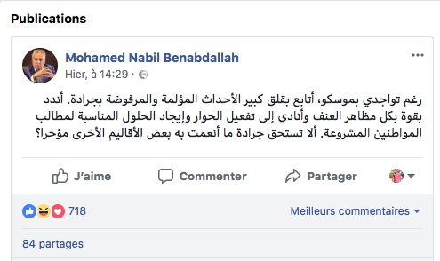 في تدوينة عبر صفحته الرسمية على الفيسبوك، وصفت بحسب مهتمين بالشأن السياسي بـ " القصف "، وجه نبيل بنعبدالله، الأمين العام لحزب التقدم و الإشتراكية، انتقادات لاذعة للمخزن، بعد حادث تعنيف محتجين بجرادة، حيث قال : " رغم تواجدي بموسكو، أتابع بقلق كبير الأحداث المؤلمة والمرفوضة بجرادة ".