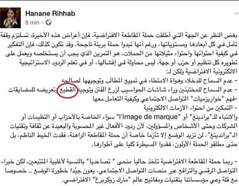 وأضافت  في ذات التدوينة « ردود الأفعال غير المحسوبة والبعيدة عن ثقافتنا وتقنيات البراندينغ، لن تزيد الوضع إلا تأزما خاصة أن حملة المقاطعة الراهنة، فقدت الخيط الناظم، بل حتى مطلقو الحملة الأولون، فقدوا السيطرة كليا على أطوارها ».