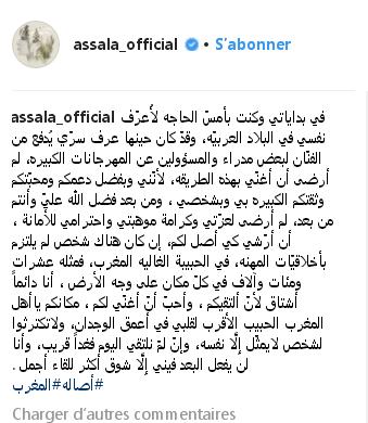 وأضافت "إن كان هناك شخص لم يلتزم بأخلاقيّات المهنه، في الحبيبة الغاليه المغرب، فمثله عشرات ومئات وآلاف في كلّ مكان على وجه الأرض ، أنا دائماً أشتاق لأنّ ألتقيكم ، وأحبّ أنّ أغنّي لكم ، مكانكم ياأهل المغرب الحبيب الأقرب لقلبي في أعمق الوجدان، ولاتكترثوا لشخص لايمثّل إِلَّا نفسه، وإنّ لمّ نلتقي اليوم فغداً قريب، وأنا لن يفعل البعد فيني إِلَّا شوق أكثر للقاء أجمل ".