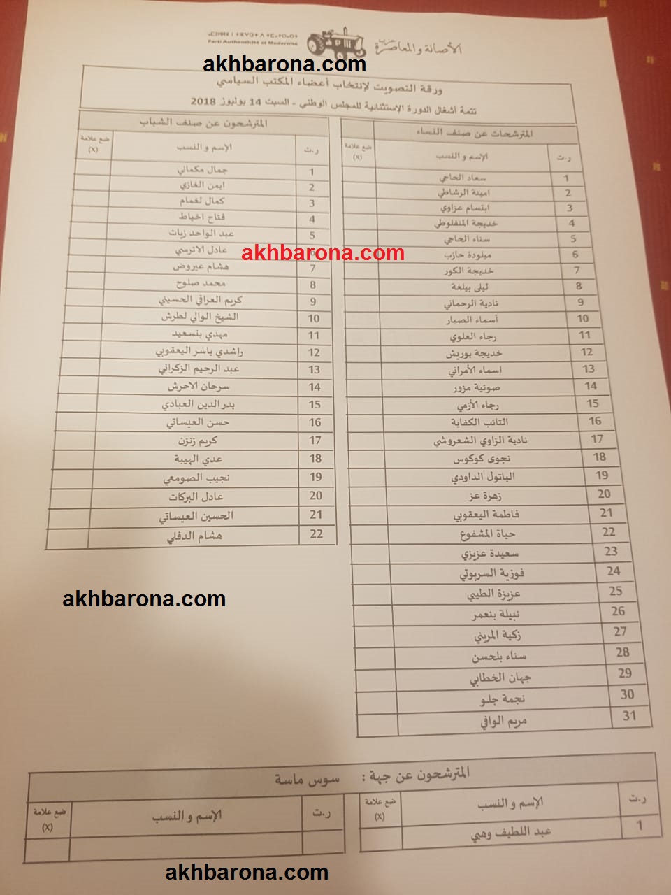 ما تزال عملية انتخاب أعضاء المكتب السياسي لحزب الأصالة والمعاصرة والمدرجة ضمن جدول أعمال تتمة أشغال الدورة الاستثنائية للمجلس الوطني، التي احتضنها قصر المؤتمرات بالولجة بمدينة سلا، متواصلة الى حدود كتابة هذه الأسطر .