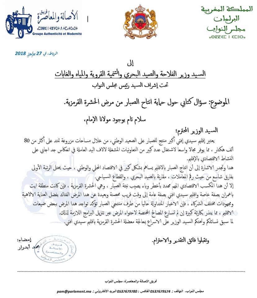 هذه الإشكالية الصعبة التي كلفت العديد من فلاحي المنطقة المذكورة خسائر مادية كبيرة جدا، استدعت بحث حلول عاجلة لمكافحتها، الشيء الذي دفع بابن المنطقة، النائب البرلماني السيد محمد أبودرار، عن حزب الأصالة والمعاصرة، إلى المسارعة إلى توجيه سؤال كتابي إلى السيد وزير الفلاحة، تحت إشراف رئيس البرلمان، طالب من خلاله بضرورة اتخاذ كافة التدابير اللازمة من أجل احتواء هذا الخطر الذي يتهدد الإقتصاد المغربي.