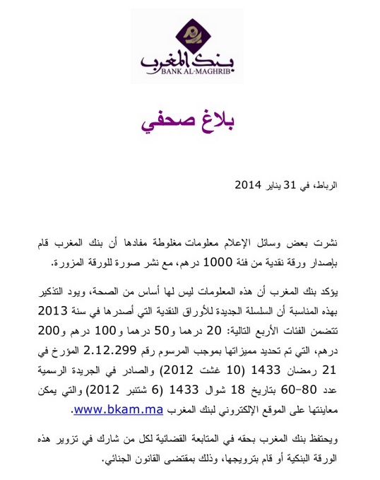 نفى بنك المغرب، اليوم الجمعة، المعلومات المغلوطة التي نشرتها بعض وسائل الإعلام ومفادها أن البنك قام بإصدار ورقة نقدية من فئة 1000 درهم.