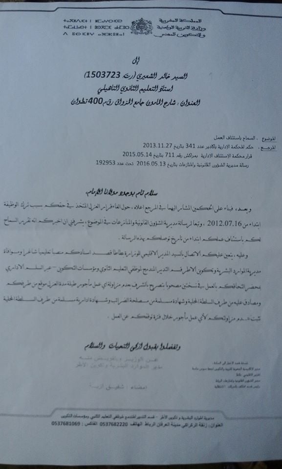 الخبر زفه الأستاذ بنفسه على الفايسبوك ، حيث أكد أنه توصل بمراسلة وزارية تفيد إرجاعه للعمل منذ يوم التوصل ، حيث سيعود إلى نيابته الأصلية طاطا حيث كان يعمل.