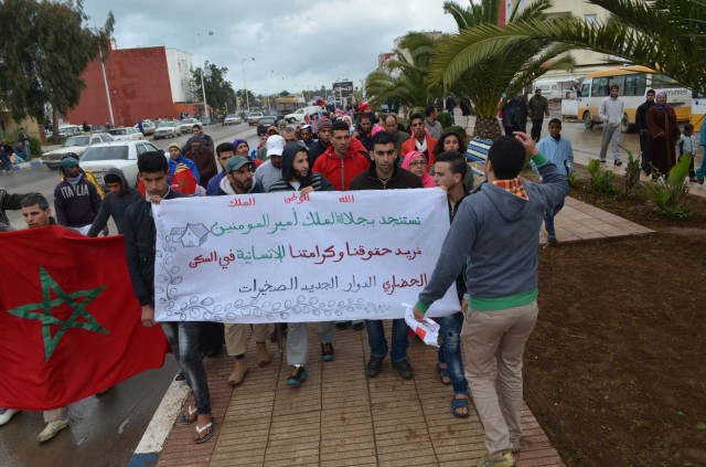 في مسيرة شعبية ليست الاولى من نوعها بالصخيرات ، خرج عشرات المواطنين من قاطني دور الصفيح بالصخيرات في مسيرة شعبية سلمية احتجاجا على وضعيتهم المزرية التي يعيشونها منذ سنين مضت بأكواخ قصدرية لا تستجيب لأبسط شروط العيش العادية .
