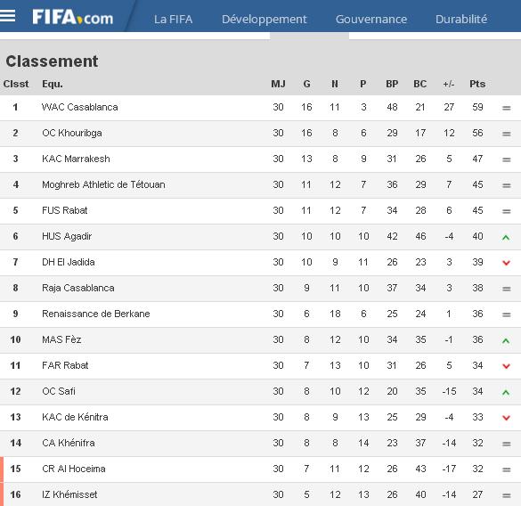 أدرج الاتحاد الدولي لكرة القدم على موقعه الرسمي، الترتيب النهائي للبطولة الاحترافية واضعا شباب اطلس خنيفرة في الصف 14 ب32 نقطة بنسبة ناقص 14 في النسبة العامة ، و شباب الريف الحسيمي في الصف 15 بناقص 17 هدفا .