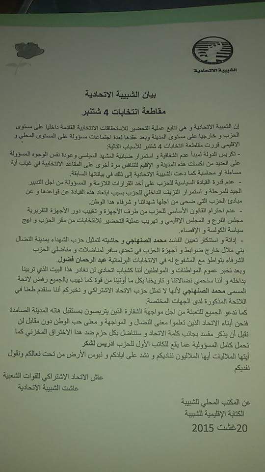 وجاء في بيان الشبيبة الاتحادية :"إن الشبيبة الاتحادية و هي تتابع عملية التحضير للاستحقاقات الانتخابية القادمة داخليا على مستوى الحزب و خارجيا على مستوى المدينة وبعد عقدها لعدة اجتماعات مسؤولة على المستوى المحلي و الاقليمي قررت مقاطعة انتخابات 4 شتنبر ".
