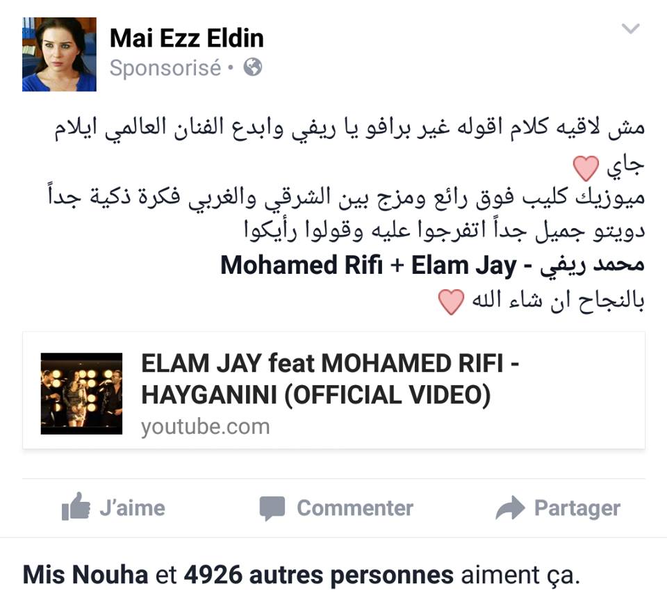 جدير بالذكر ان مي عز الدين كتبت على حائطها الخاص : " مش لاقية كلام أقوله غير برافو يا ريفي ، و ابداع الفنان العالمي إيلام جاي ... ميوزيك كليب فوق رائع ومزع بين الشرقي و الغربي ، فكرة ذكية جدا ... دويتو جميل جدا ، اتفرجوا عليه و قولوا رأيكوا " .