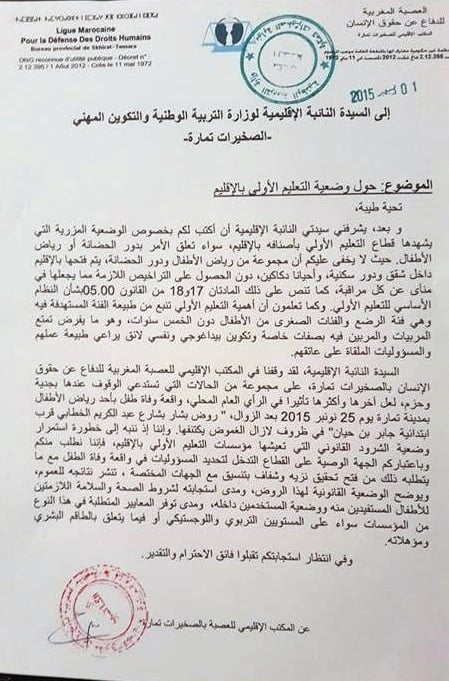 بعد حادث وفاة رضيع بأحد رياض الأطفال قبل أيام بمدينة تمارة على يد مربيته ، و ما خلفه من ردود افعال قوية ، نتيجة هذا السلوك غير المقبول من طرف المربية ، تابعت العصبة المغربية للدفاع عن حقوق الانسان هذا الملف بكل اهتمام ، حيت قامت بمراسلة النائبة الاقليمية لوزارة التربية الوطنية و التكوين المهني السيدة ربيعة الصالحي ، و طالبتها بتحمل مسؤوليتها الكاملة فيما داخل مؤسسات التعليم العمومي منه و الخصوصي ، و هذا ما جاء في الرسالة :