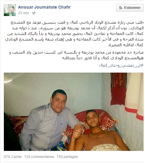 بتنسيق مع أحد أصدقائه المقربين ، فاجئ محمد بودريقة رئيس فريق الرجاء البيضاوي ، المشجع الوداد كمال الذي بترت ساقه خلال رحلته رفقة الوداد بأكادير ، بزيارة خاصة لبيته ، حيت أجهش كمال بالبكاء يقول صديقه من شدة الفرح ، حينما رأى بودريقة شخصيا ببيته.