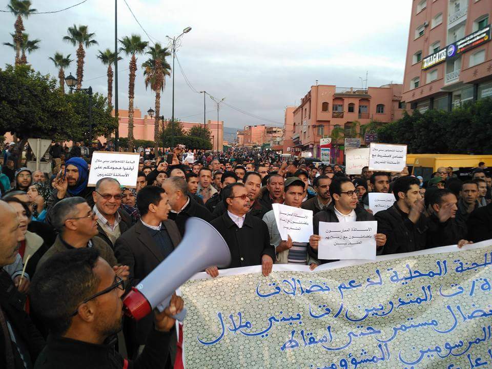 خرج الاساتذة المتدربين بمركز التربية والتكوين ببني ملال ،مساء امس في مسيرة حاشدة انتهت بوقفة احتجاجية بساحة المسيرة الخضراء .