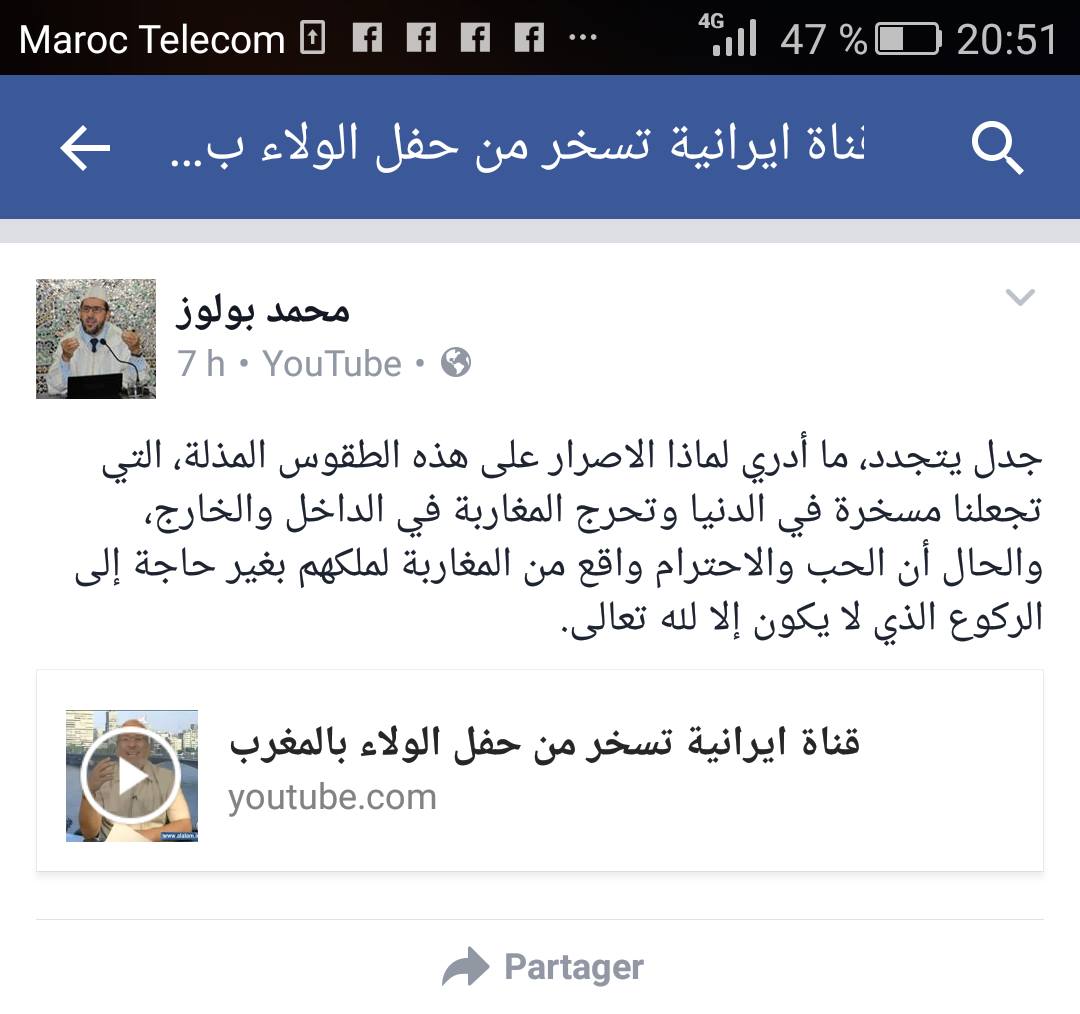 في ذات السياق ، نشر محمد بولوز القيادي في حزب العدالة و التنمية و حركة التوحيد و الاصلاح ، الجناح الدعوي للبيجيدي ، تدوينة نارية عبر حائطه الخاص بالفيسبوك ، انتقد من خلالها بشدة طقوس حفل الولاء ، واصفا إياها بالمذلة ، حيث كتب : " جدل يتجدد، ما أدري لماذا الاصرار على هذه الطقوس المذلة، التي تجعلنا مسخرة في الدنيا وتحرج المغاربة في الداخل والخارج، والحال أن الحب والاحترام واقع من المغاربة لملكهم بغير حاجة إلى الركوع الذي لا يكون إلا لله تعالى ".