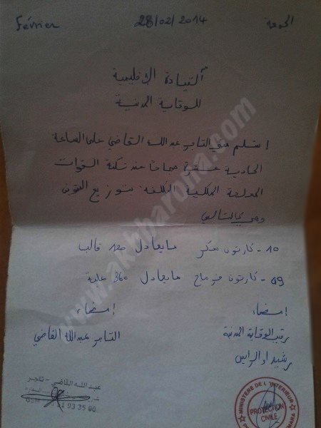 اهتزت القيادة الإقليمية للوقاية المدنية بالسمارة، على وقع فضيحة اختلاس تموينات و مساعدات غذائية مدوية ، عقب تداول وثيقة مؤرخة بتاريخ 28 من فبراير 2014 ، تحمل ختم رقيب اول ، أكد من خلالها هذا الاخير ، انه سلم تاجرا بالمدينة موادا غذائية امام تكنة القوات المسلحة الملكية المكلفة بتوزيع التموين ، محددا عدد و نوع المواد التي جرى تقديمها للتاجر ، دون تحديد قيمتها المادية.