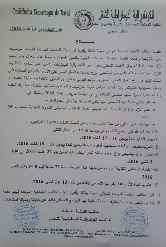 أصدرت الكنفدرالية الديموقراطية للشغل بلاغا تصعيديا توصلت "أخبارنا" بنسخة منه، ضد شركتي النظافة ومجلس مدينة الدار البيضاء، بعد ما اعتبرته سياسة الاذان الصماء التي قوبل بها ملف الشغيلة، وتجاهل مطالب العمال المثمثلة في الزيادة في منحة العيد، وعدم التزام شركة النظافة في ترسيم العمال المؤقتين المستوفين للشروط القانونية، وكذا محاربة النقابيين والتضييق عليهم بالطرد والتنقيل، حسب ما جاء بالبلاغ.