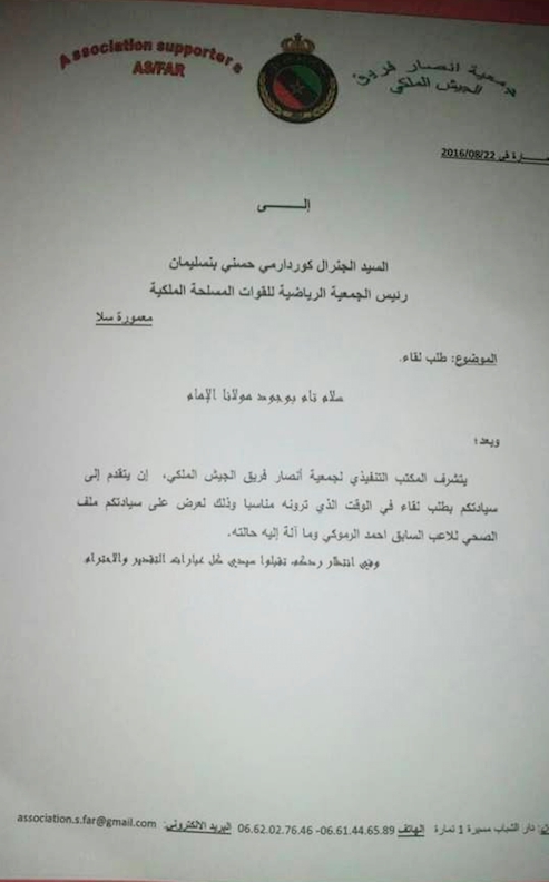 و كانت " جمعية انصار فريق الجيش الملكي " قد راسلت الجينرال حسني بنسلمان بهذا الشأن ، قبل ان تتلقى مكالمة هاتفية تؤكد أن الجينرال قد اعطى تعليماته بالتكفل بمصاريف هذا اللاعب السابق الذي يمر بظروف صحية و اجتماعية صعبة للغاية .