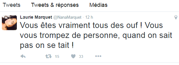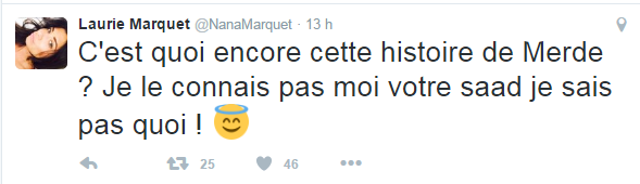 و نشرت الحسناء الفرنسية على حسابها بموقع تويتر تغريدات أكدت من خلالها بأن لا علاقة لها بقضية اعتقال المغني المغربي ، كما أوردت العديد من المواقع الاخبارية العالمية في الساعات الماضية .