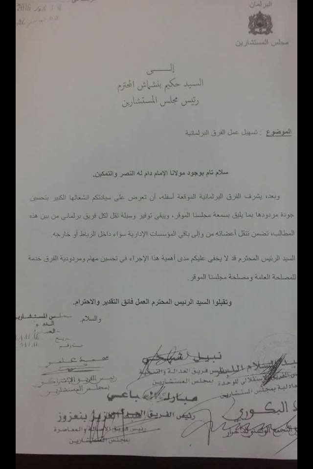 فحسب الوثيقة التي تم تسريبها، فإن رؤساء الفرق الواردة أسماؤهم وتوقيعاتهم أسفلها التمسوا من رئيس المجلس حكيم بنشماس الموافقة على طلب حصول كل فريق على سيارة خدمة "لائقة" تضمن "تحسين جودة الخدمات التي يقومون بها وتليق بسمعة المجلس".