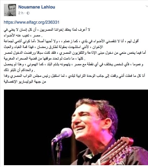 وبلغة صريحة و مباشرة أوضح الفنان المغربي أن : " أي شخص يختلف في أي نقطة مع مصر ، يتهمونه بشتم البلد ، كما اتهموني ، وهذا لم يحصل واتحداكم أن تثبتوا ذلك ، فكل ما فعلت أنني وقفت إلى جانب الوحدة الترابية لبلدي ، لما استقبل رئيس مجلس النواب المصري وفدا من جبهة البوليساريو الإنفصالية ".