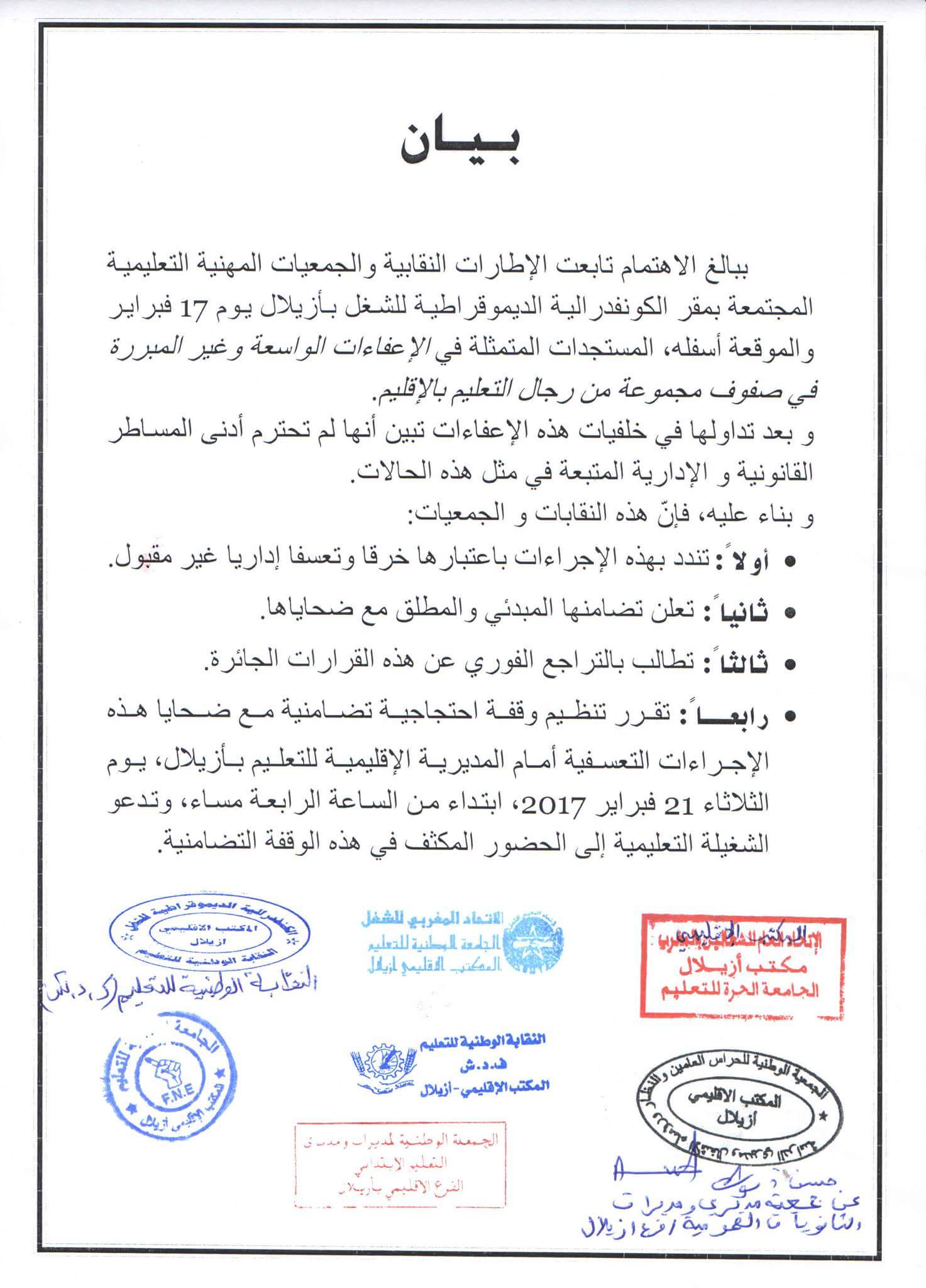 ببالغ الاهتمام تابعت الإطارات النقابية والجمعيات المهنية التعليمية المجتمعة بمقر الكونفدرالية الديموقراطية للشغل بأزيلال يوم 17 فبراير والموقعة أسفله، المستجدات المتمثلة في الإعفاءات الواسعة وغير المبررة في صفوف مجموعة من رجال التعليم بالإقليم.