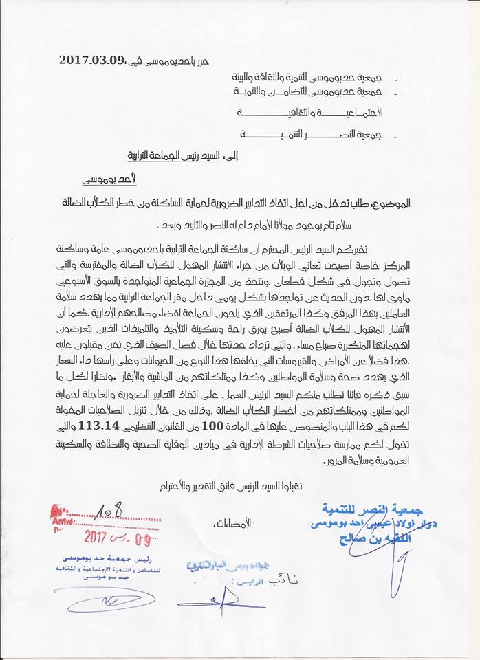 ففي الرسالة التي حصلت "أخبارنا" على نسخة منها والموقعة من طرف جمعية حدبوموسى للتنمية والثقافة والبيئة وجمعية حدبوموسى للتضامن والتنمية الاجتماعية والثقافية وجمعية النصر للتنمية ، أكدت أن ساكنة الجماعة الترابية باحدبوموسى عامة وساكنة المركز خاصة اصبحت تعاني الويلات من جراء الانتشار المهول للكلاب الضالة والمفترسة والتي تصول وتجول في شكل قطعان ،وتتخذ من المجزرة الجماعية المتواجدة بالسوق الاسبوعي مأوى لها ،دون الحديث عن تواجدها بشكل يومي داخل مقر الجماعة الترابية مما يهدد سلامة العاملين بهذا المرفق وكذا المرتفقين الذي يلجون الجماعة لقضاء مصالحهم الإدارية.