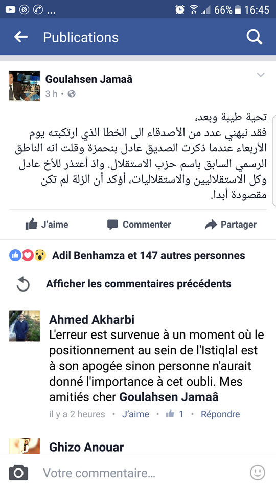 و قال كولحسن في تدوينة في صفحته الرسمية بالفيسبوك : " نبهني عدد من الأصدقاء الى الخطا الذي ارتكبته يوم الأربعاء عندما ذكرت الصديق عادل بنحمزة وقلت انه الناطق الرسمي السابق باسم حزب الاستقلال. واذ أعتذر للأخ عادل وكل الاستقلاليين والاستقلاليات، أؤكد أن الزلة لم تكن مقصودة أبدا " .