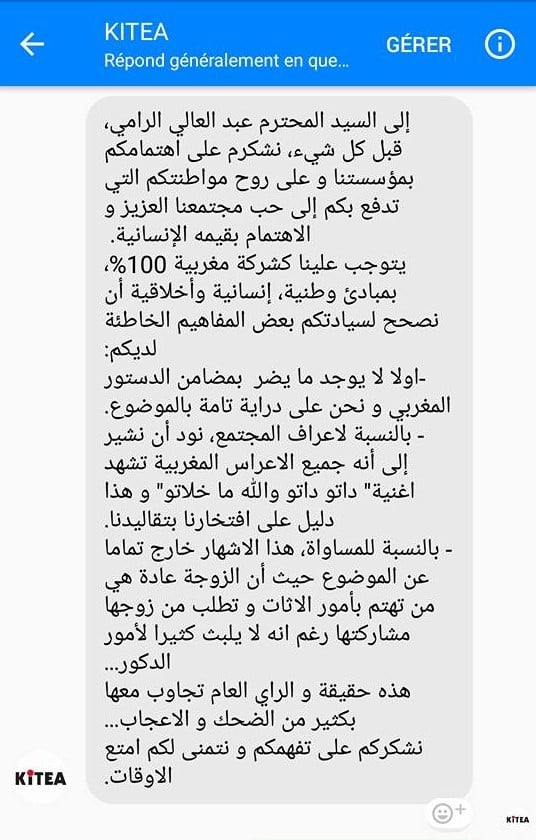 بعد أن تسبب ملصق إشهاري لشركة "كيتيا" (KITEA)، المتخصصة في مجال أثاث وأكسسوارات البيوت والمكاتب، في غضب رواد موقع التواصل الاجتماعي "فيسبوك"، بسبب لوحة إشهارية اعتبرت بحسب " النشطاء " ، حاطة بكرامة الرجل المغربي ، تصور رجلا تجره زوجته بحبل في مشهد مشين ( الصورة )، توصل الفاعل الجمعوي و الحقوقي السيد عبد العالي الرامي ، الذي كان أول من نشر هذه الصورة التي أثارت جدلا كبيرا - توصل - برسالة خاصة من الشركة المذكورة ، قدمت خلالها تبريراتها لما وصفه النشطاء بـ " الإهانة غير المقبولة للرجال " ، هذا ما جاء فيها :