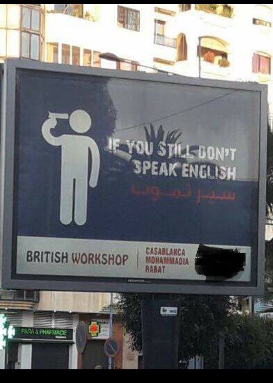 و كتب على اللوحة الاشهارية عبارة بالانجليزية معناها " إذا كنت لا تزال لا تتكلم الإنجليزية ، فـ " سير تموت " ، مع وضع رسم توضيحي لشخص يطلق النار على نفسه.