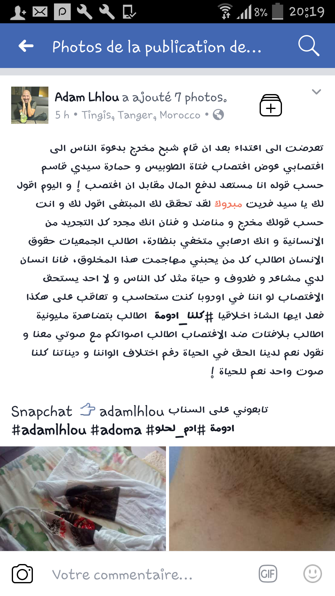 و كتب ادومة على حسابه بموقع التواصل فايسبوك "تعرضت لاعتداء بعد ان قام شبح مخرج بدعوة الناس الى اغتصابي عوض اغتصاب حمارة فتاة الطوبيس او سيدي قاسم حسب قوله انا مستعد لدفع المال مقابل ان اغتصب".