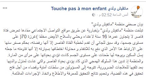 وجاء بيان "ماتقيش ولدي" أنها بلغت بإخبارية عن طريق مواقع التواصل الاجتماعي مفادها تعرض فتاة قاصر لا يتجاوز عمرها 16 سنة لاعتداء وحشي بالسلاح الأبيض مخلفا غرزة 70 على مستوى جسمها، وقد سبق للجاني أن تقدم لخطبة الفتاة القاصر إلا أنها رفضته، بحكم صغر سنها على الارتباط ،هذا الأمر الذي دفع به للانتقام و محاولة اختطافها بسيارته إلا أنها قاومته ما جعله يسل السكين ويوجه لها طعنات على مستوى الجسم كادت تؤدي بحياتها على مرأى من المارة.