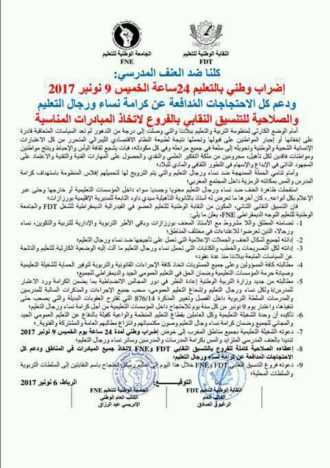 واعتبرت ذات النقابات أن ماوقع هو نتيجة طبيعية و إفراز موضوعي لاستمرار الخطاب الرسمي في إهانة الأسرة التعليمية و تبخيس دورها في المجتمع و الإمعان في تكريس أزمتها الإجتماعية و المهنية و الإدارية و التربوية.